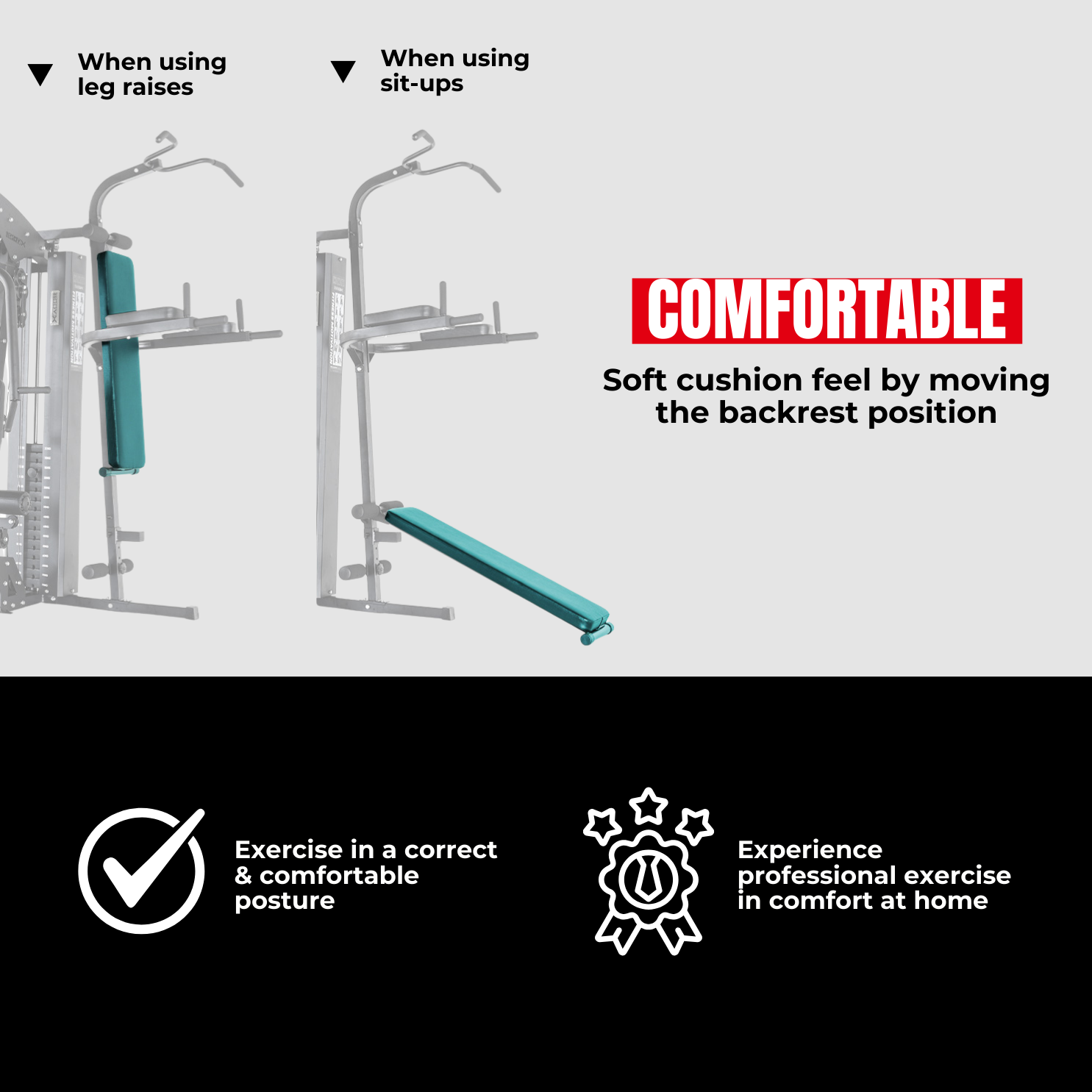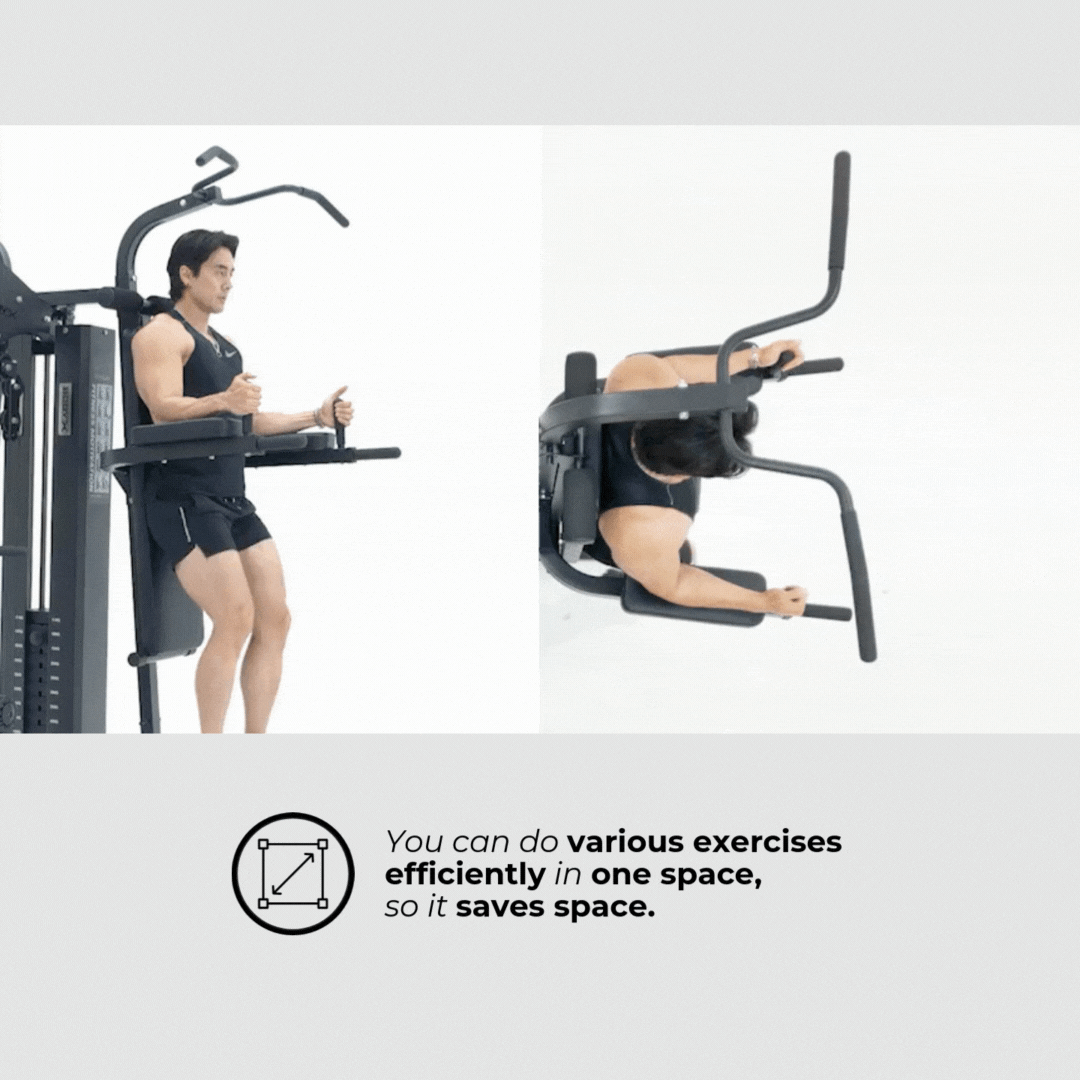 - Sistem Latihan Ganda – Press Arm + Kabel Pulley memberikan opsi hingga lebih dari 16 gerakan untuk latihan multifungsi seluruh otot tubuh.