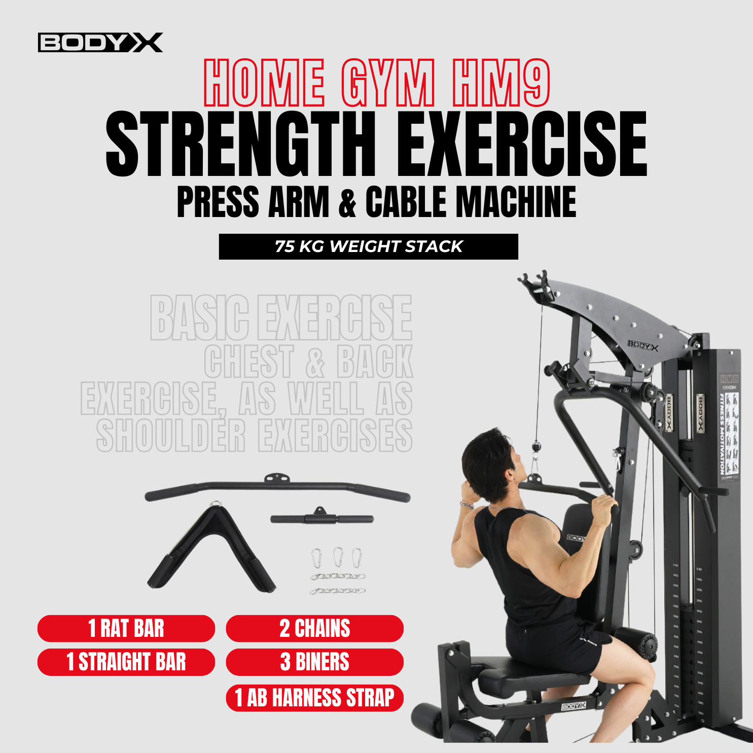 Dengan kombinasi press arm bertenaga dan sistem kabel multifungsi, BODYX HM9 memungkinkan Anda melakukan latihan seluruh tubuh – dari dada, punggung, bahu, lengan, kaki hingga otot inti – dalam satu alat fitness profesional untuk rumah.