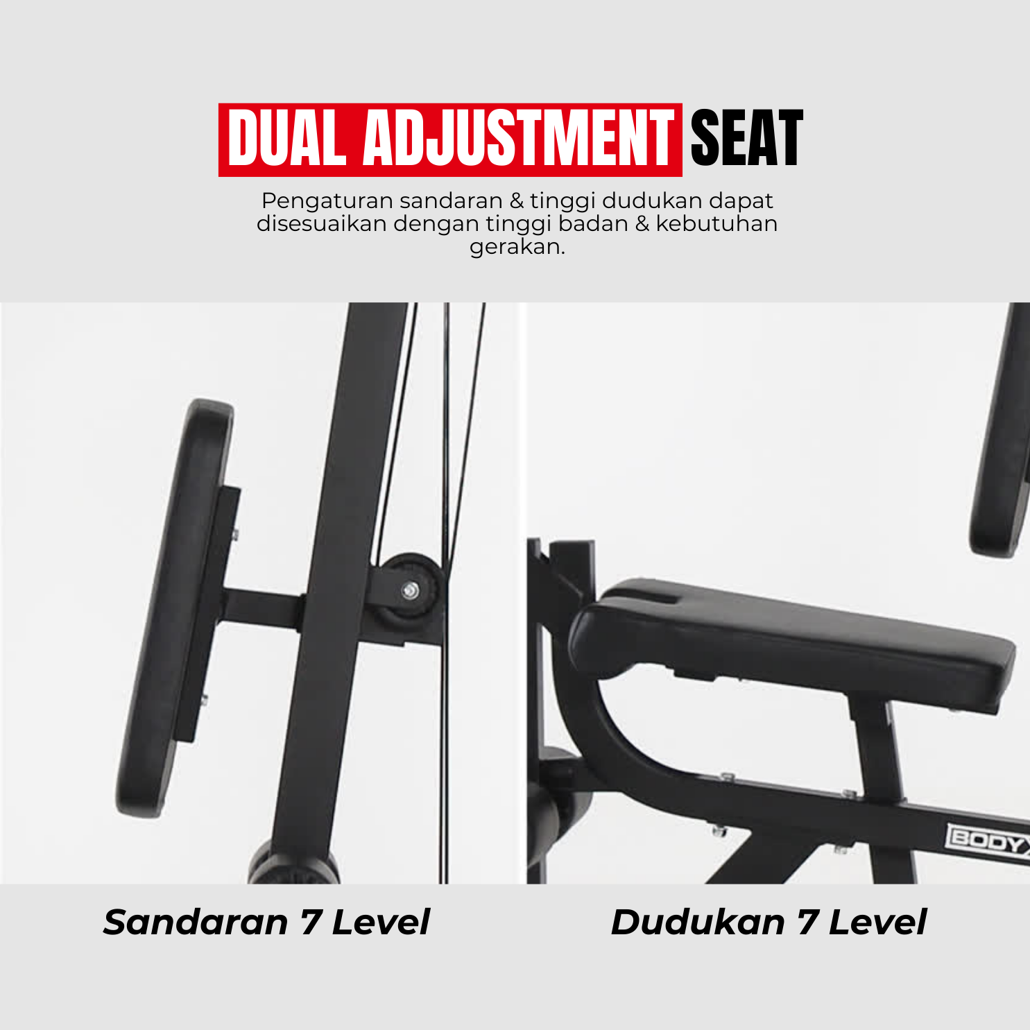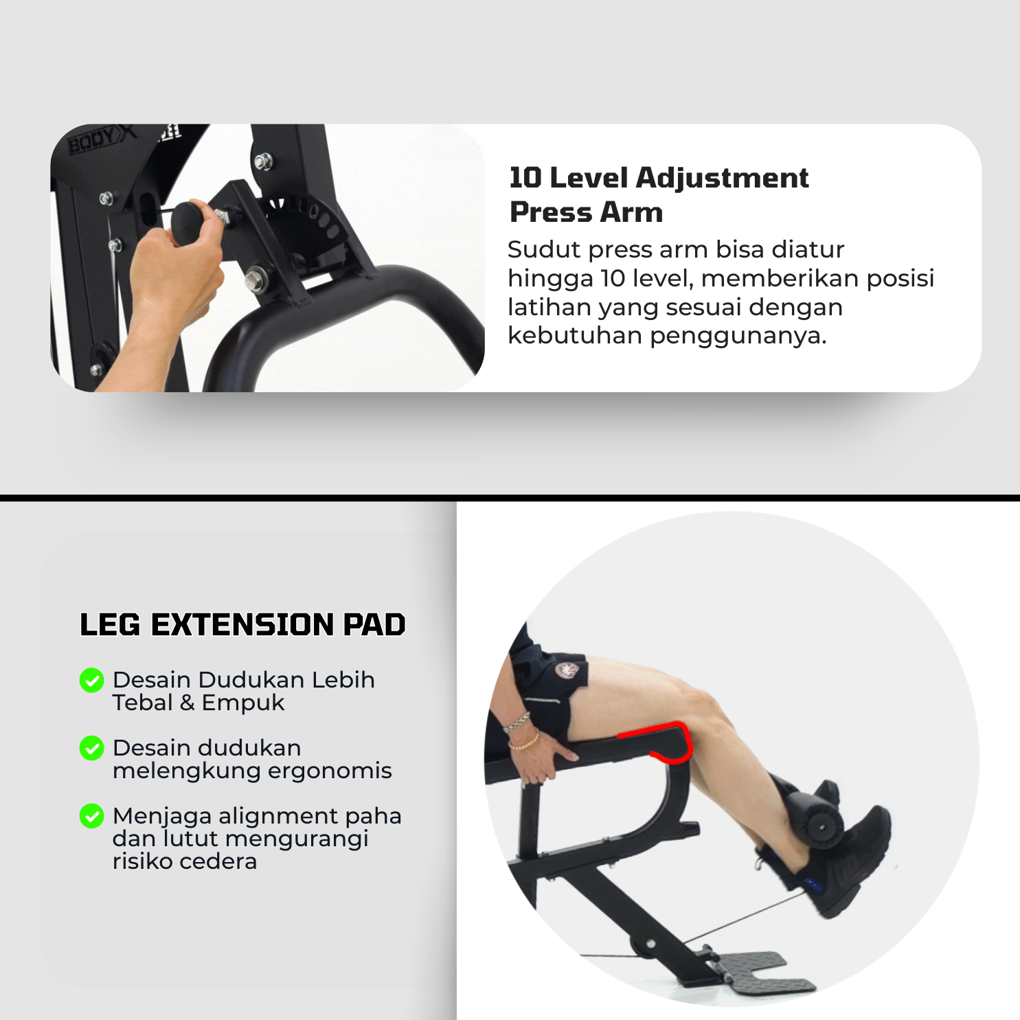 - Press Arm 10 Level – Atur sudut latihan sesuai kebutuhan dan otot target.