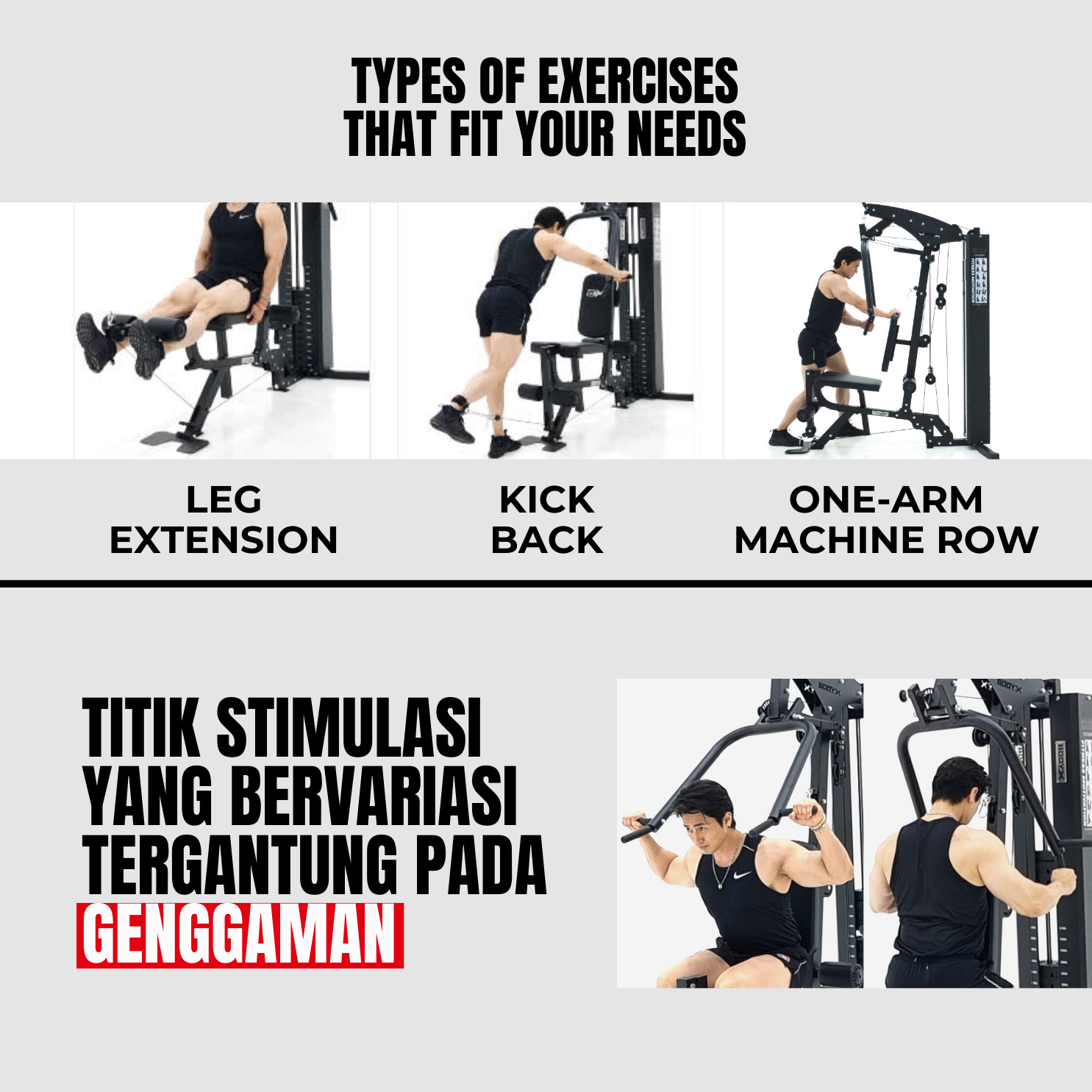 - Sistem Latihan Ganda – Press Arm + Kabel Pulley memberikan opsi hingga lebih dari 16 gerakan untuk latihan multifungsi seluruh otot tubuh.