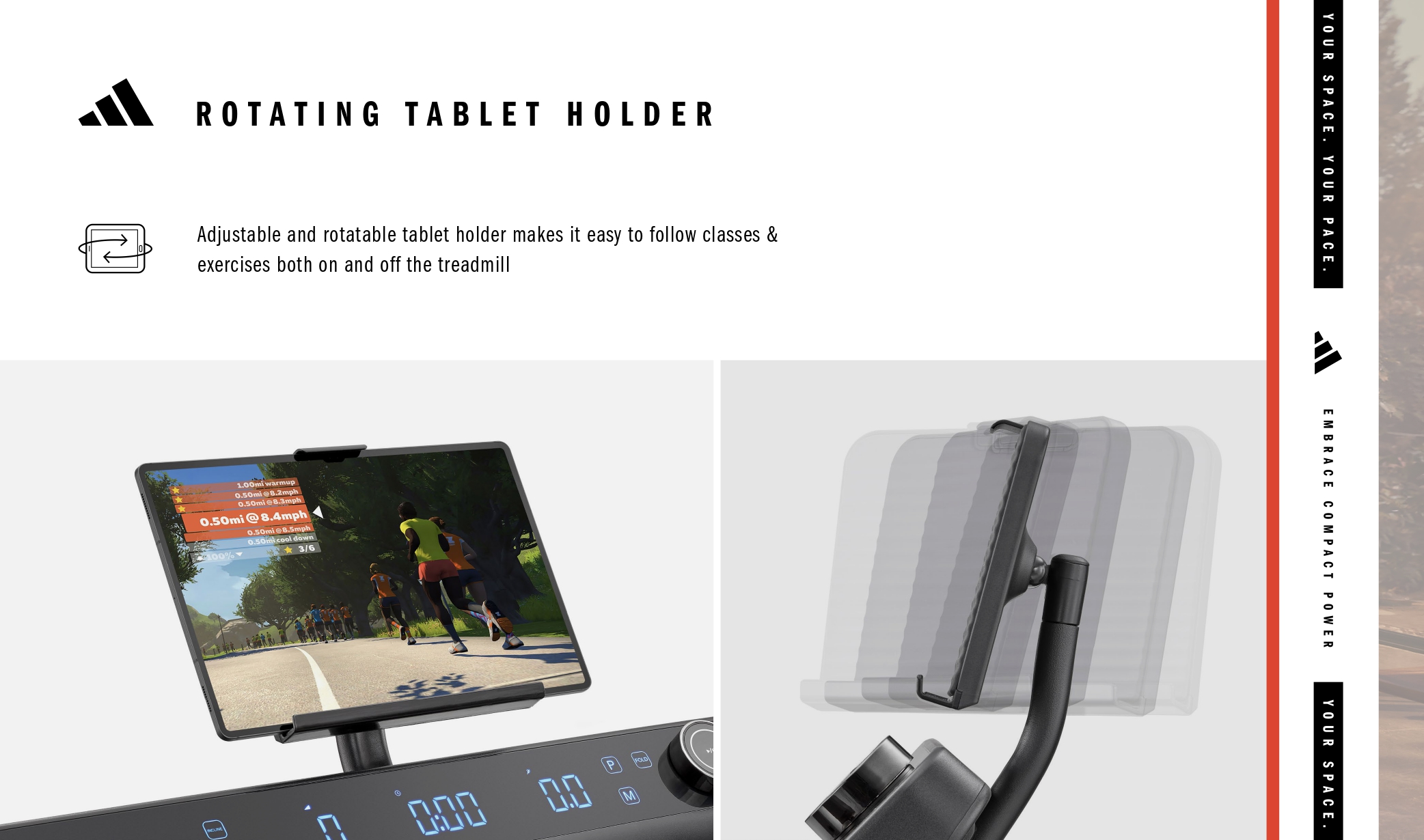 - Built-in Rotating Device Holder – Gadget Stand yang bisa diputar dan atur sudut pandang ideal sesuai kenyamanan untuk menonton atau ikuti workout. Get the Perfect Viewing Angle.