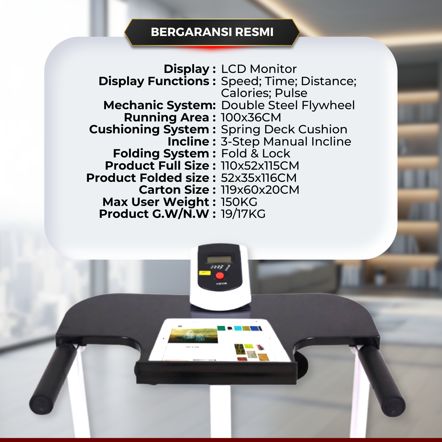 - System Folding Vertical: Treadmill dapat dilipat secara vertical untuk menghemat ruang.
