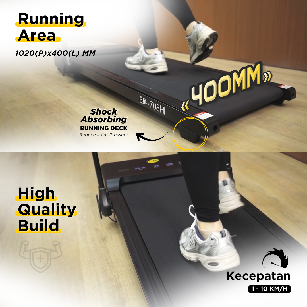 BFIT 708HI adalah Running Pad Elektrik dengan Motor Dinamo 1HP dan average daya 200-300W. Kebutuhan listrik bergantung pada 2 faktor penting: 1) Kecepatan Penggunaan; dan 2) Bobot diatas Treadmill, dan bisa lebih rendah atau lebih tinggi dari rata-rata.