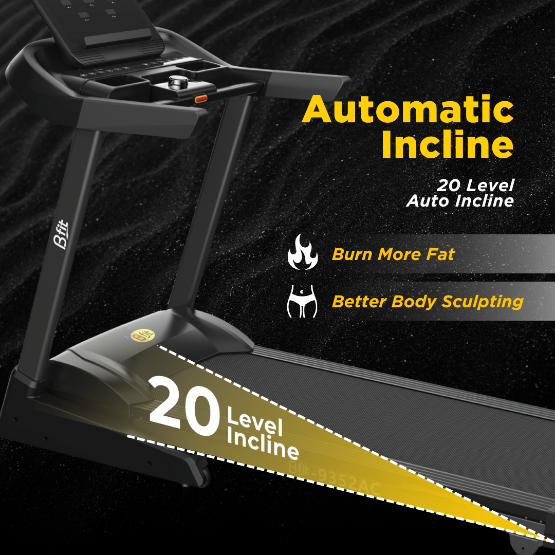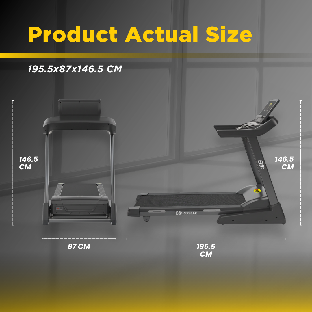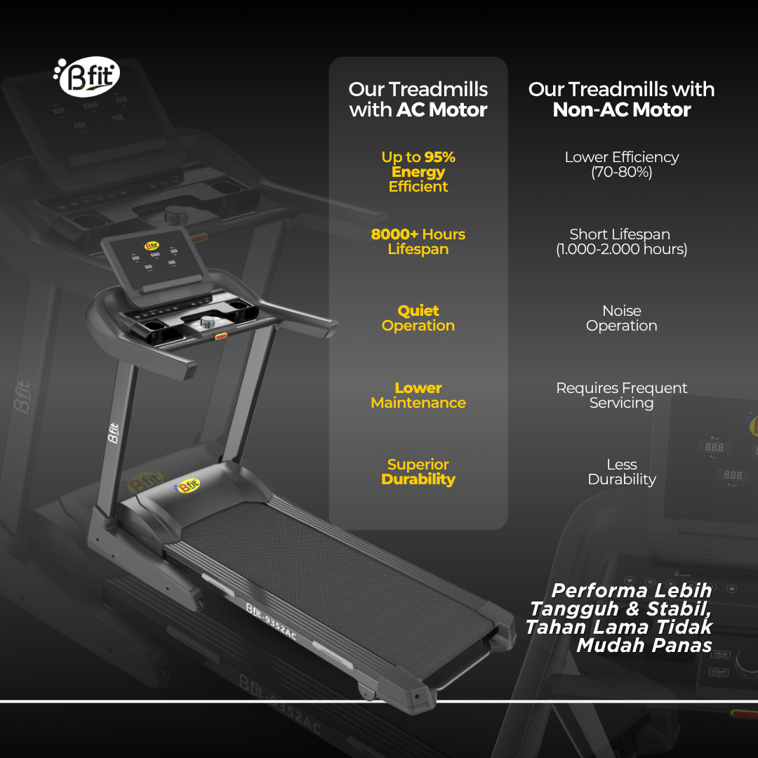 BFIT 9352AC adalah Treadmill Listrik Multifungsi dengan Motor AC Dinamo 2HP dan average daya 500-600W. Kebutuhan listrik bergantung pada 2 faktor penting: 1) Kecepatan Penggunaan; dan 2) Bobot diatas Treadmill, dan bisa lebih rendah atau lebih tinggi dari rata-rata.