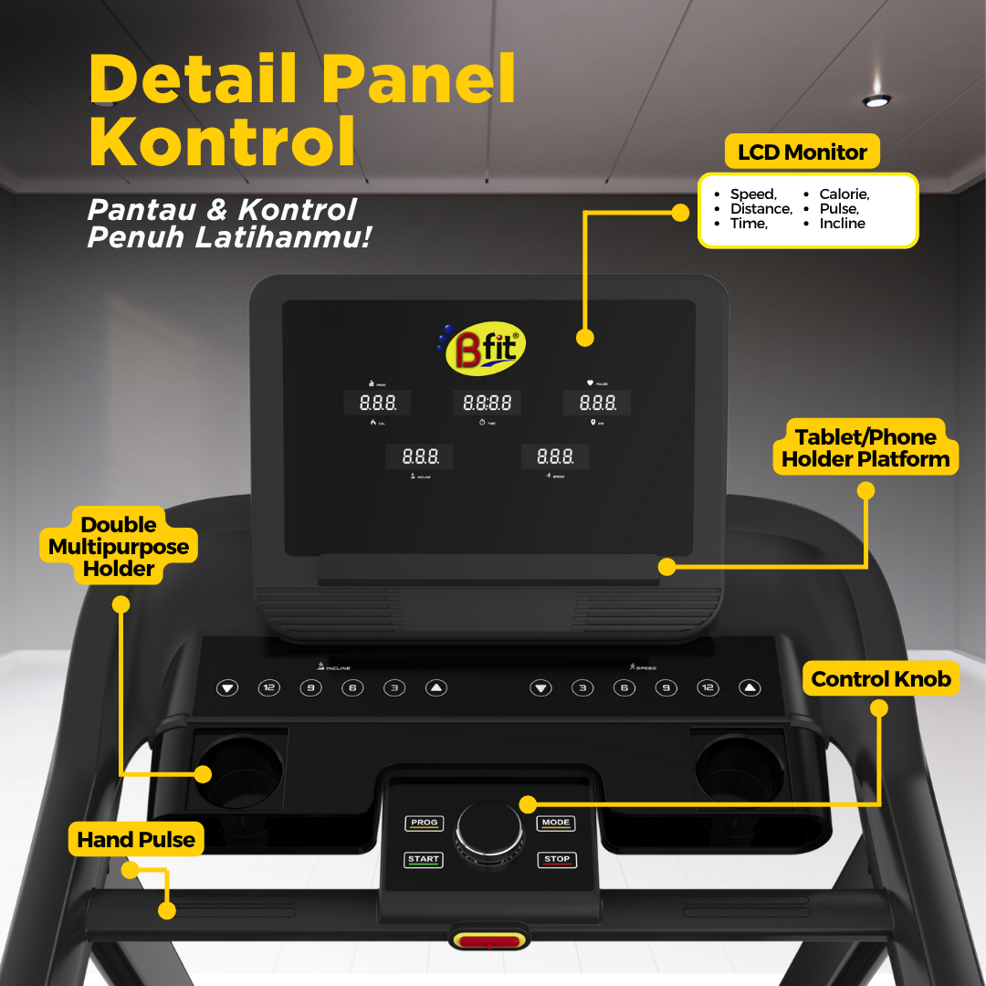 - BIG LCD Monitor: Menampilkan Speed, Time, Distance, Calories, Incline, dan Pulse