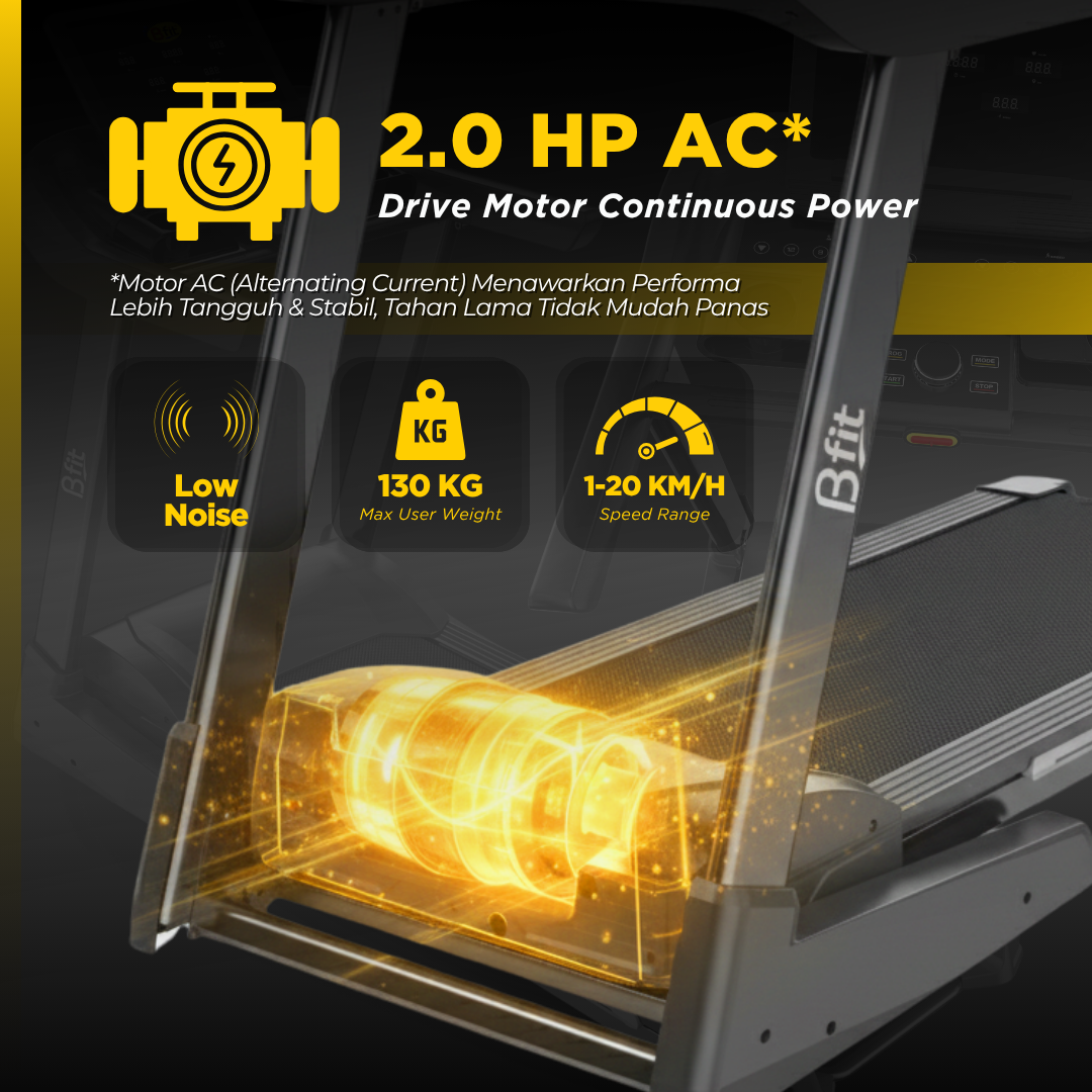 - Treadmill menggunakan motor AC (Alternating Current) – Performa Lebih Tangguh dan Stabil, Tahan Lama Tidak Mudah Panas