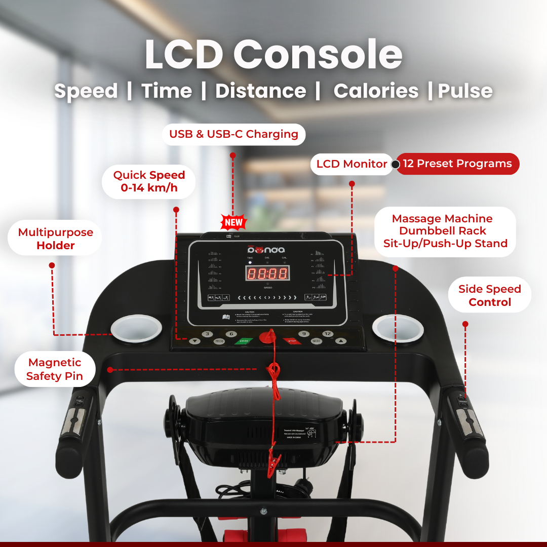- Double Multipurpose Holder: Tempat penyimpanan botol & lainnya di kedua sisi dashboard Treadmill
