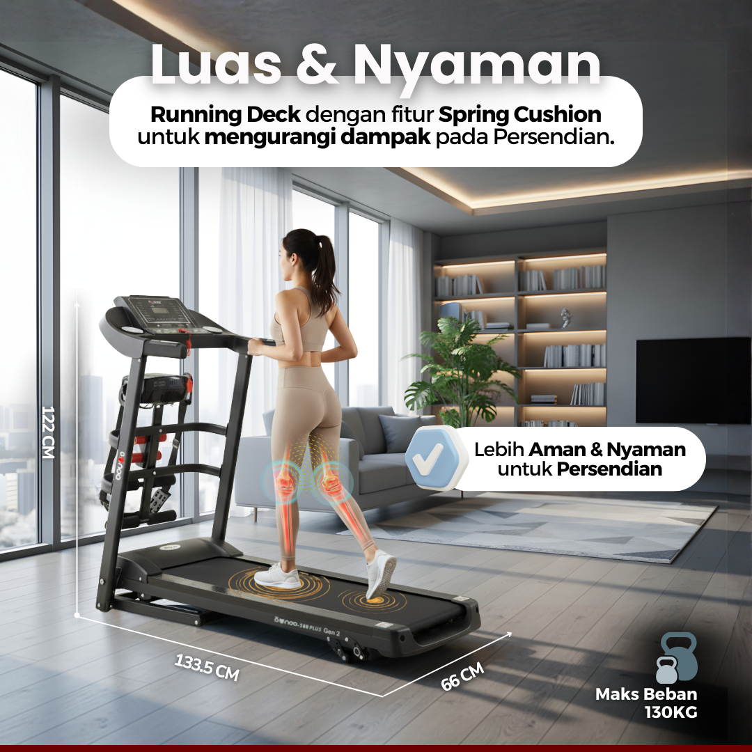 - Spring Cushion Running Deck: Papan Lari Empuk dengan Teknologi Spring Cushion yang Mengurangi Dampak Pada Sendi