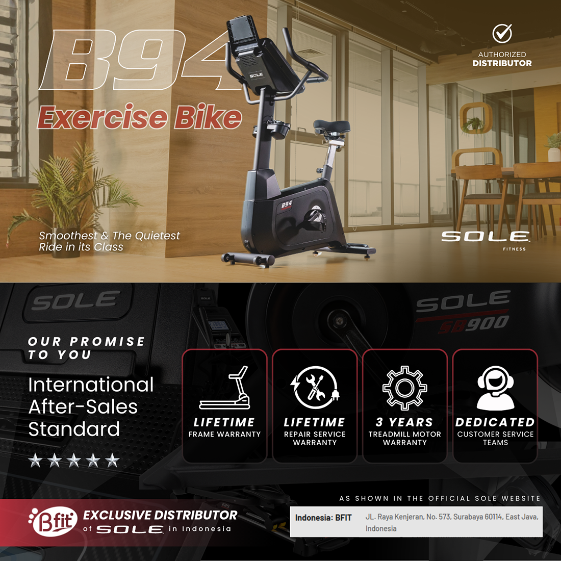 Dijamin oleh layanan resmi Bfit Indonesia selaku Distributor Official Eksklusif untuk SOLE Fitness, dengan dukungan teknisi dan spare part asli jangka panjang.