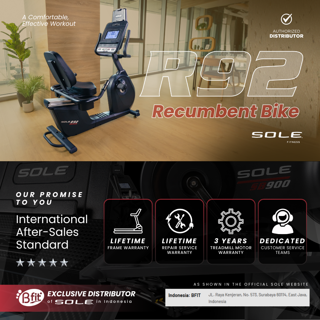Dijamin oleh layanan resmi Bfit Indonesia selaku Distributor Official Eksklusif untuk SOLE Fitness, dengan dukungan teknisi dan spare part asli jangka panjang.